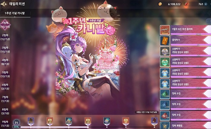 현재 1주년임에 따라 다양한 이벤트가 진행중이며, 그 중에서도 1주년 기념 카니발이 대표적이다. 해당 카니발에서는 데일리 미션이 주어지고 있기에 이를 중심으로 플레이한다면 매우 푸짐한 보상을 얻을 수 있다.