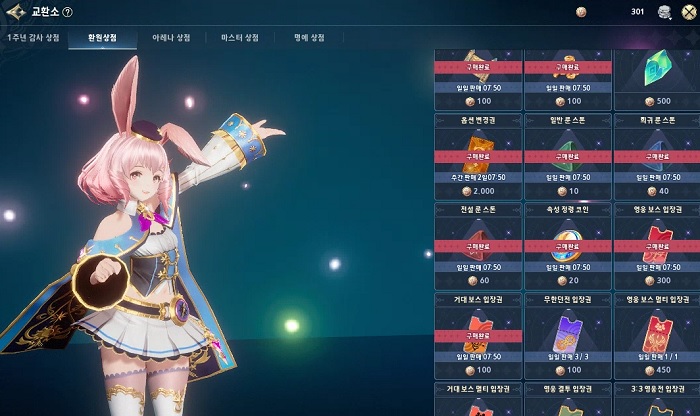 상점과 교환소에서 매일 필수적으로 구매해야하는 아이템이 존재한다. 우선 상점에서는 매일 무료 선물을 판매하며, 일반 상점 탭의 요일 상점과 주간 상점에서도 골드 판매 상품을 필히 구매해야 한다. 특히 요일 상점의 계승자의 기록과 룬 스톤 넥서스 코인 등은 꼭 구입하도록 하자. 추가로 주간 상점의 카드 소환권 및 장신구 소환권은 20% 할인된 가격에 구입할 수 있다.