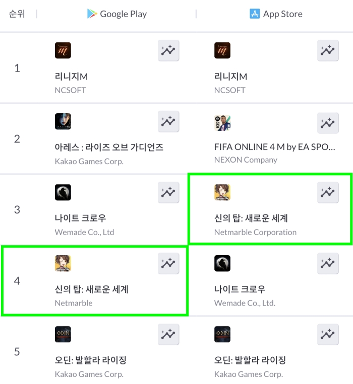 <신의 탑: 새로운 세계>는 출시 하루 만에 한국 앱스토어 매출·인기 1위에 올랐으며, 지난 27일 구글플레이에서도 인기 1위를 차지했다. 한국뿐만 아니라, 4시간만에 대만, 태국, 인도네시아 4개국 애플 앱스토어 인기 1위를 시작으로 일본 3위, 말레이시아 4위, 홍콩 5위 등 인기 TOP5에 오른 바 있다.