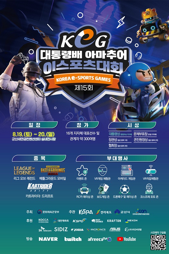 문화체육관광부가 주최하고 협회와 전라북도, 군산시, 전라북도콘텐츠융합진흥원이 주관, 한국콘텐츠진흥원, 대한체육회, 국민체육진흥공단, 라이엇 게임즈, 크래프톤, 넥슨코리아, SK텔레콤, 시디즈, 조마, 마이크로닉스, 에이수스, 미진비엔엘이 후원하는 제15회 ‘대통령배 아마추어 이스포츠 대회’(KOREA e-SPORTS GAMES, 이하 대통령배 KeG)의 ‘지역 대표 선발전’이 지난 7월 한 달간 전국 16개 지역에서 완료됐다. 그 결과 총 172명의 지역 대표가 참가하는 대통령배 KeG ‘전국 결선’이 8월 19일(토), 20일(일) 양일간 군산새만금컨벤션센터 실내전시장(전라북도 군산)에서 열린다.