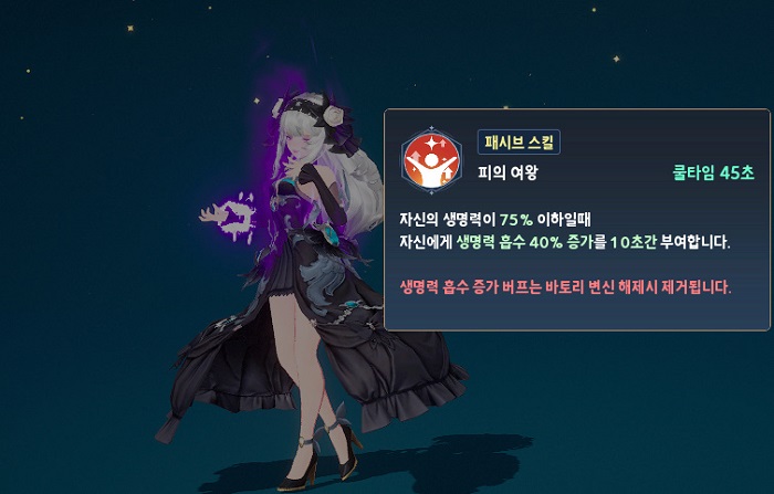 패시브 스킬은 '피의 여왕'과 '흡혈귀의 속삭임' 2종을 보유하고 있다. 피의 여왕은 자신의 생명력이 75% 이하일 때 생명력 흡수 40% 증가 효과를 부여하기에 생존력을 높이는 수단이 마련돼 있는 셈이다. 다음으로 흡혈귀의 속삭임은 적에게 치명타 대미지를 입히면 30% 확률로 실명을 부여하는데, 이를 통해 매우 유리한 상황에서 전투를 펼칠 수 있다.