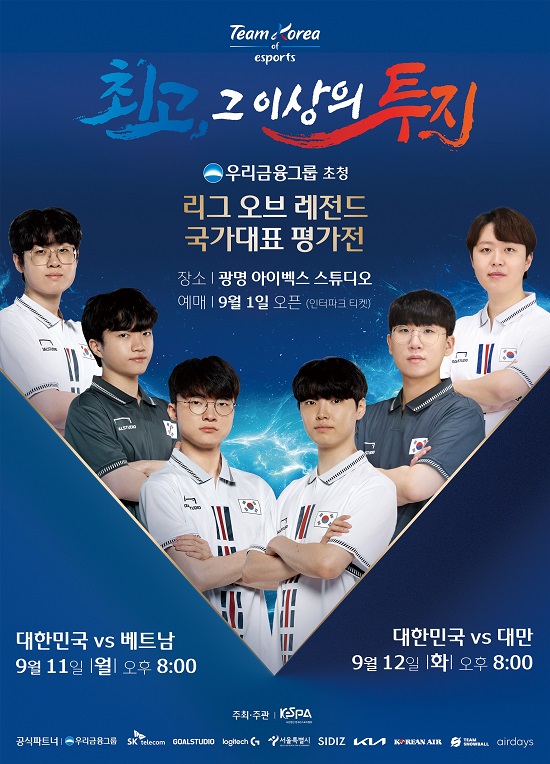 이번 평가전은 e스포츠 국가대표 후원사인 우리금융그룹의 초청으로 리그 오브 레전드(이하 LoL) 종목으로 진행되며, 오는 9월 11일(월), 12일(화) 오후 8시부터 양일간 광명 아이벡스 스튜디오(경기 광명)에서 진행된다.