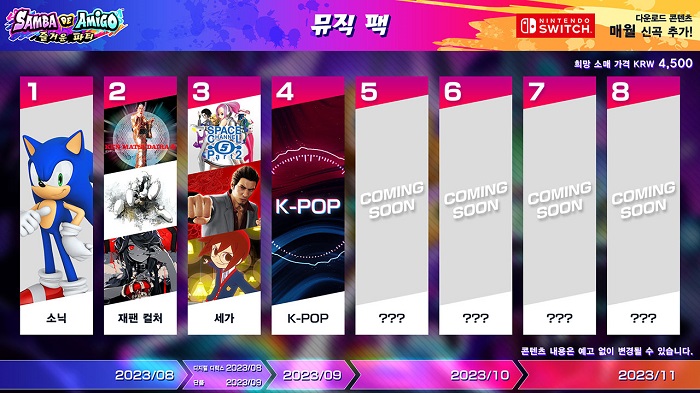 세가퍼블리싱코리아(대표 사이토 고)는 2023년 8월 30일(수) 발매 예정인 Nintendo Switch™용 소프트 'Samba de Amigo : 즐거운 파티'에 대한 다운로드 콘텐츠(DLC)의 내용을 공개했다.