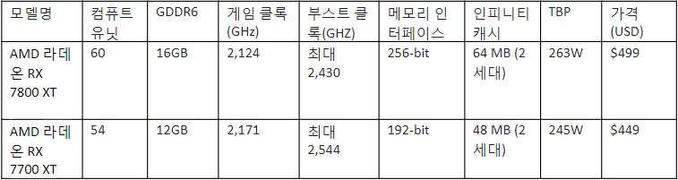 AMD 라데온 RX 7800 XT 및 RX 7700 XT 그래픽 카드 스펙