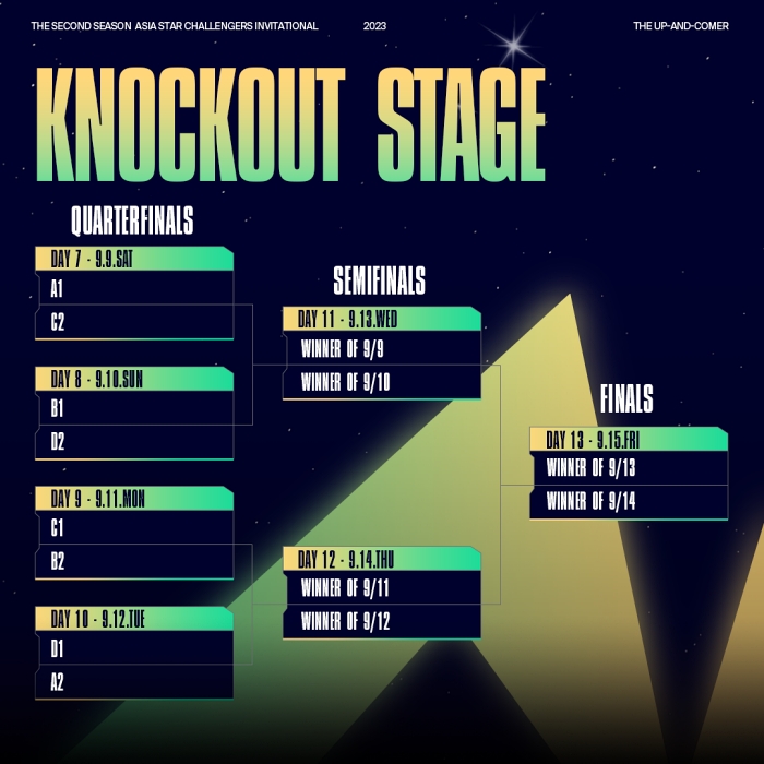 8강부터 결승까지 진행되는 방식인 녹아웃 스테이지의 경우 8강 대진표는 16강 조 1위 팀이 다른 조의 2번 시드와 대결하도록 짜여지며 모든 경기는 5전 3선승제로 진행된다.