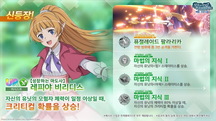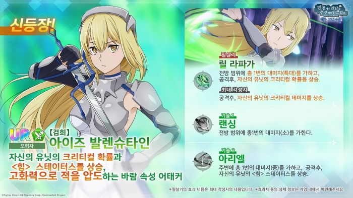 한편 ‘던크로’에서는 새로운 모험자 캐릭터 ‘검희’ 아이즈 발렌슈타인과 새로운 어시스트 캐릭터 ‘성장하는 마도사’ 레피야 비리디스의 픽업 뽑기를 개최 중이다.