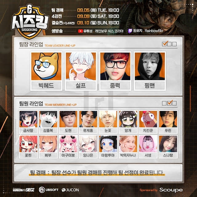 2023 시즈킹은 총 20명의 레인보우 식스 시즈 스트리머가 5명씩 팀을 이뤄 대결을 펼치는 특별 이벤트 매치다. 특히 ‘빅헤드’, ‘실프’, ‘중력’, ‘핑맨’ 등 참가자 전원이 개성 넘치는 플레이 스타일과 화려한 입담을 자랑하고 있어 그 어떤 대회보다도 경기의 보는 재미가 높을 것으로 보인다.