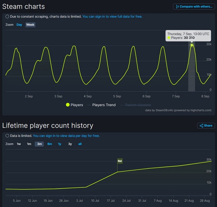 ‘이터널 리턴’은 3년 간의 스팀 앞서 해보기 서비스를 마치고, 지난 7월 20일 정식 서비스로 전환했다. 이전 5천 명 대였던 동시 접속자 수는 2만 명 대까지 증가했고, PC방 순위도 30위권에서 10위권까지 상승했다. 이후로도 각종 지표에서 꾸준히 우상향 그래프를 그렸고, 지난 9월 7일 ‘동시 접속자 수 3만 명을 돌파하며 인기를 이어가고 있다.