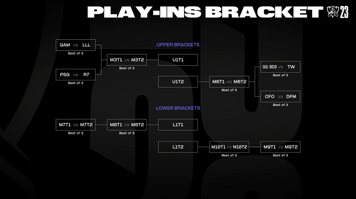 같은 티어의 팀은 플레이-인 스테이지 첫 경기에서 만나지 못한다는 원칙 아래 진행된 조 추첨식 결과 A조에는 VCS 대표 GAM 이스포츠와 CBLOL 대표 라우드, PCS 대표 PSG 탈론, LLA 대표 모비스타 R7이 편성됐으며 B조에는 2023년 새롭게 도입한 월드 챔피언십 선발전 시리즈(WQS) 승자와 VCS 대표 팀 웨일즈, PCS 대표 CTBC 플라잉 오이스터, LJL 대표 데토네이션 포커스미가 포진됐다.
