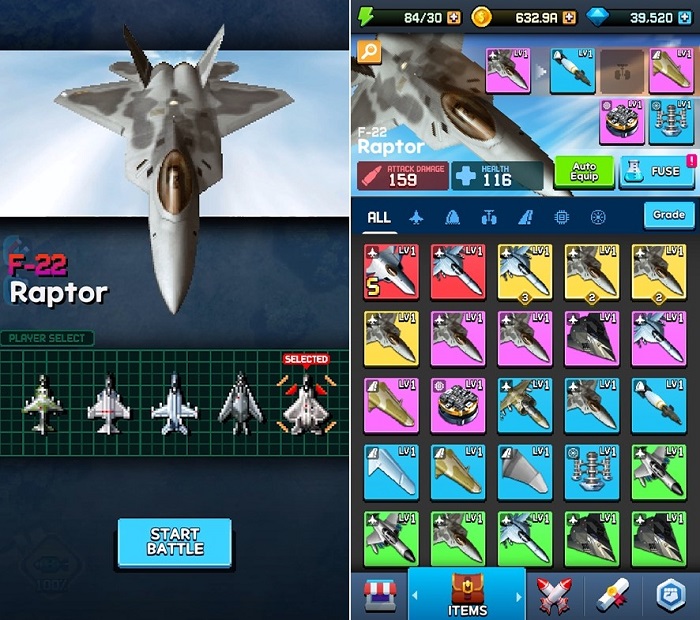 기체와 장비는 일반, 우수, 레어, 엘리트, 에픽, 전설까지 6단계로 구분되는데 게임 내 재화인 코인과 강화 스크롤을 사용하여 레벨을 올릴 수 있고, 동일한 등급의 기체나 장비를 합성하면 상위 등급으로 진화시킬 수 있다.