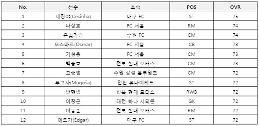 EA는 공식 카카오톡 채널을 통해 FC24의 K리그 상위 등급의 12개 구단 선수 리스트와 자세한 능력치가 공개했다. 이중 가장 높은 오버롤 75를 받은 선수는 대구 FC의 세징야(Cesinha), 그 외 2명이 74, 3명이 73, 6명이 72를 받았다.