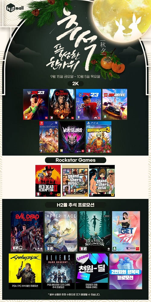 또한 H2몰을 비롯한 국내 쇼핑몰 및 게임샵에서는 같은 기간 동안 ‘레드 데드 리뎀션 2’, ‘GTA V’, ‘GTA: 트릴로지 – 데피니티브 에디션’, ‘PGA TOUR 2K23’, ‘쿼리’, ‘타이니 티나의 원더랜드’, ‘WWE 2K23’, ‘레고 2K 드라이브’, ‘보더랜드 3’, ‘문명 VI’, ‘사이버펑크 2077’ 및 ‘에이리언: 다크 디센트’ 등의 타이틀에 대해 특별 할인 이벤트가 진행될 예정이다.