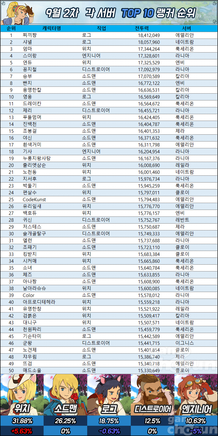 각 직업별 최고 순위 달성자는 다음과 같다. 로그는 에델리안 서버 찌끼쨩이 1위, 위치는 룩세리온 서버 '엄마'가 3위, 엔지니어는 라니아 서버 '스이랑'이 4위, 디스트로이어는 라니아 서버 '꽁지철'이 6위, 소드맨은 칼리아 서버 '승부'가 7위다. 캐릭터 점유율 면에선 공식 대회 이후 위치가 다시 30% 이상으로 복귀, 반면 엔지니어는 10% 수준으로 하락해 희비가 교차했다.