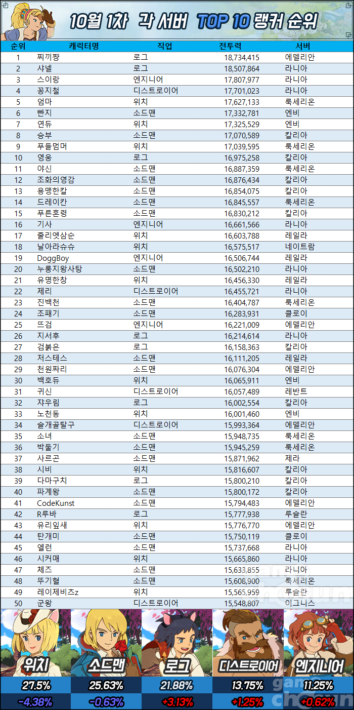 각 직업별 최고 순위 달성자는 다음과 같다. 로그는 에델리안 서버 찌끼쨩이 1위, 엔지니어는 라니아 서버 '스이랑'이 3위, 디스트로이어는 라니아 서버 '꽁지철'이 4위, 위치는 룩세리온 서버 '엄마'가 5위, 소드맨은 엔비 서버 '빤지'가 6위다. 랭커 직업 비율은 2일부터 시작된 서버 이동으로 많은 변동이 있었다. 특히 20%를 넘긴 로그의 비율이 인상적이다. 이와 같은 변화는 서버 이전이 완전히 끝나는 10일까지 계속될 것으로 예상된다.