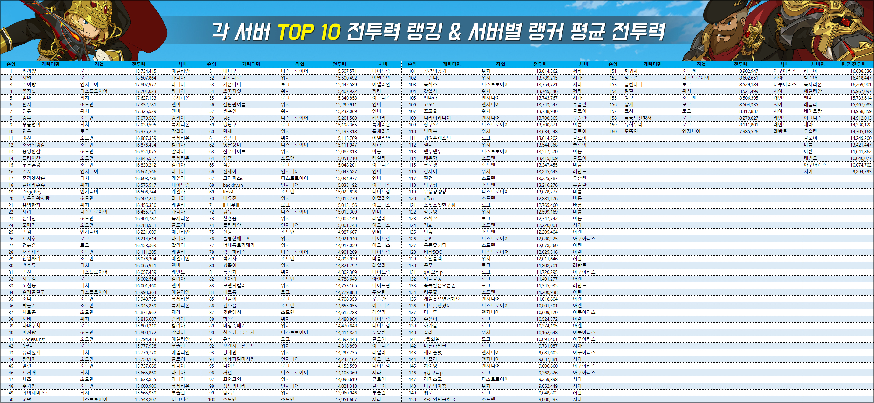각 서버 상위 10인, 총 160인의 평균 전투력은 94,227 하락한 14,063,451을 기록했다. 이는 서버 이전으로 인한 랭커들의 랭킹 인아웃에 따른 일시적인 감소로 보이며, 많은 랭커가 꾸준히 전투력을 높이는 중이다. 지난 집계 이후 주요 업데이트로는 풍성한 가을 출석부, 카오스 균열, 풍성한 가을 핫타임 등 추석맞이 이벤트 및 콘텐츠 추가가 있었다.