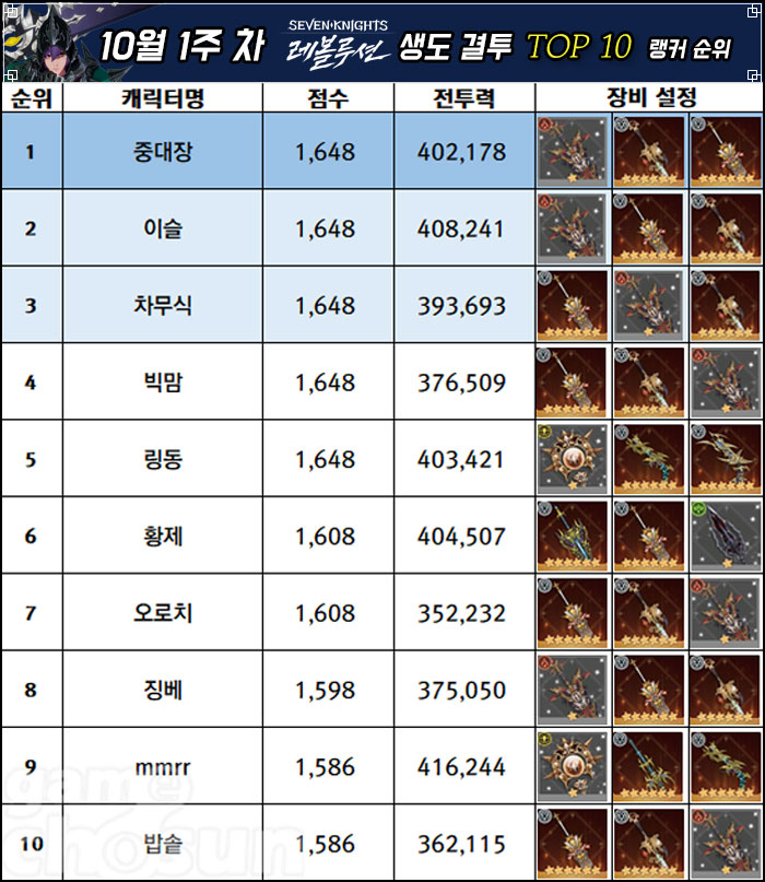 생도 결투에서는 여전히 '라스트 커맨더'가 가장 많이 사용되는 영웅 무기로 자리매김하고 있으며, 뒤를 이어 '별의 포옹'이 두 번째로 많은 선택을 받았다. 또 TOP 10 내에서 1명의 랭커가 '속죄의 창'을 활용 중에 있다. 영웅 결투에서는 모든 랭커가 '워커홀릭 레이첼'을 힐러로 기용하는 한편, '검은 정의 실베스타'를 주력 영웅으로 활용하는 모습이다.