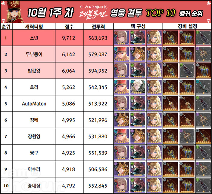 넷마블의 모바일 MMORPG '세븐나이츠 레볼루션'의 10월 1주차, 생도 결투에서는 '중대장', '이슬', '차무식' 등 5명의 랭커가 동점을 이루며 1위를 기록했으며, 영웅 결투 부문에서는 '소년' 유저가 압도적인 점수 차로 최정상에 올랐다. 또 전투력 랭킹에서는 링동 유저가 계속해서 1위를 유지하고 있다.