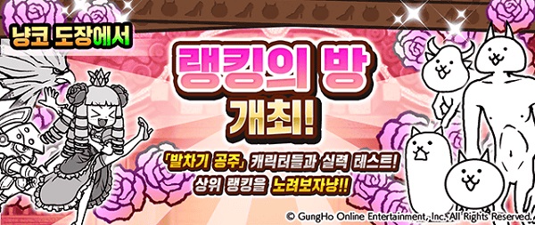냥코 도장 ‘랭킹의 방’에 콜라보 기간 한정 랭킹 이벤트 ‘습격! 발차기 공주 군단’이 개최된다. ‘발차기 공주 돌격대’ 캐릭터가 다수 등장하는 실력 테스트 스테이지이다.