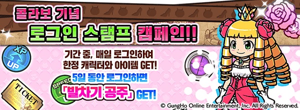 콜라보 기간 중 로그인하면 하루에 한 개씩 다양한 아이템을 받을 수 있으며, 5일간 로그인하면 콜라보 한정 EX캐릭터 ‘발차기 공주’를 획득할 수 있다.