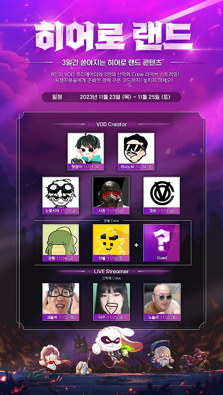 먼저 오는 24일 크리에이터 ‘코브’, ‘눈꽃서리’, ‘공룡’, ‘각별’, ‘청원’, ‘시온’, ‘시넌쓰’, ‘카사노박TV’ 유튜브 채널을 통해 많은 이용자와 만난다. 크리에이터 모두는 각자의 방식으로 ‘히어로 랜드’가 가진 매력을 전할 계획이다. 이어 25일에는 트위치 스트리머 산악회 멤버인 ‘괴물쥐’, ‘다주’, ‘노돌리’가 라이브 방송으로 ‘히어로 랜드’를 플레이한다. 3명은 실시간으로 시청자와 소통하면서 ‘히어로 랜드’ 특유의 게임성과 재미를 생생하게 보여줄 예정이다.