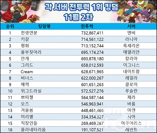 11월 2차 킹덤 랭킹 전 서버 1위는 엔비 서버 '천생연분' 킹덤이다. 천생연분 킹덤의 전투력은 50,671,388 증가한 732,867,411을 기록했으며, 2위 라니아 서버 '키갈' 킹덤과 전투력 차이는 18,306,289다. 지난 랭킹에서 키갈 킹덤이 6개월 만에 1위를 탈환했지만 오래 가지 못하고 천생연분 킹덤이 다시 전 서버 킹덤 전투력 랭킹 1위를 되찾았다.