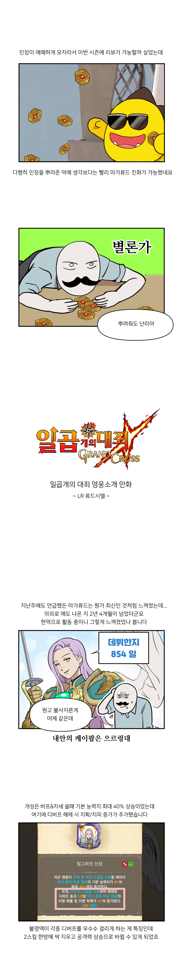 이번 작품은 지난 11월 16일 새롭게 LR 라인업에 합류한 'LR[섬광의 강림] 빛의 맹약 류드시엘(이하 LR류드시엘)을 다룬다. LR류드시엘은 태생부터 페스티벌로 등장했고, 공방을 보조하는 디버프 해제 스킬과 전체 적의 스킬효과를 차단하는 필살기로 여신족 파티의 핵심 영웅이었다.