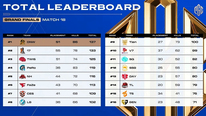 2위는 중국의 ‘17게이밍(17Gaming)’이 차지했다. 17게이밍은 강력한 교전력을 바탕으로 다나와 이스포츠 등과 함께 치열한 우승 경쟁을 펼쳤으나 끝내 133포인트로 2위에 머물렀다. 3위에는 ‘트위스티드 마인즈(Twisted Minds)’가 자리했다.