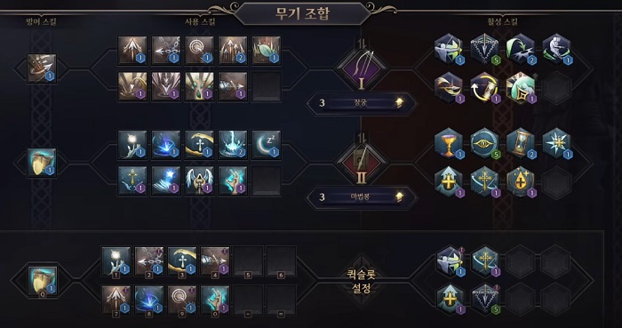퀵슬롯에는 사용 스킬 12종과 활성 스킬 8종을 등록 가능하며, 캐릭터가 착용하고 있는 무기 2종의 사용 스킬 및 활성 스킬을 퀵슬롯에 등록해 자유롭게 발동하는 것이 가능하다. 가령 장궁을 착용하고 있는 상태에서 기본 공격을 가하다가, 퀵슬롯에 등록된 마법봉 스킬을 발동할 경우에, 해당 마법봉 스킬 시전 후에 다시금 장궁으로 되돌아와 기본 공격을 이어가는 형태다. 또 패시브 스킬 개념인 활성 스킬은 퀵슬롯에 등록 시에 해당 무기를 사용하고 있지 않더라도 스킬의 효과가 적용된다.