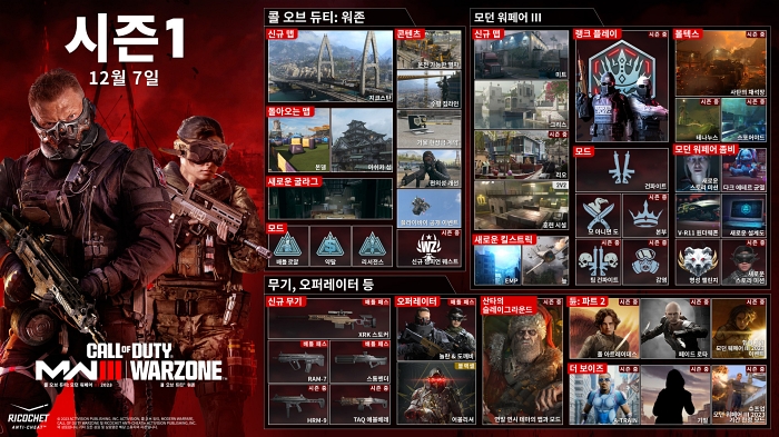 모던 워페어 III 2023의 첫 번째 시즌 역시 오늘부터 시작, 플레이어들에게 에너지 넘치는 전투의 장을 선사한다. 멀티플레이어(Multiplayer) 모드에는 그리스(Greece), 훈련 시설(Training Facility), 리오(Rio), 도축장(Meat) 등 네 곳의 신규 전장이 추가되며, 빠른 호흡의 전투를 쉴 틈 없이 만끽할 수 있는 2:2 총격전(Gunfight)도 돌아온다. 좀비(Zombies) 모드에는 엔드 게임 콘텐츠가 기다리는 새로운 지역으로 진입할 수 있는 문이 열리는 가운데, 정해진 시간 내에 일련의 목표를 완수하고 보상을 획득하면서 마치 미로를 헤쳐 나가는 임무 경험을 즐길 수 있는 다크 에테르 균열(Dark Aether Rifts) 콘텐츠가 새로 적용된다. 창궐하는 좀비들에 맞서는 싸움에 힘이 되도록 더 강력해진 원더 웨폰들도 플레이어들의 선택을 기다린다.