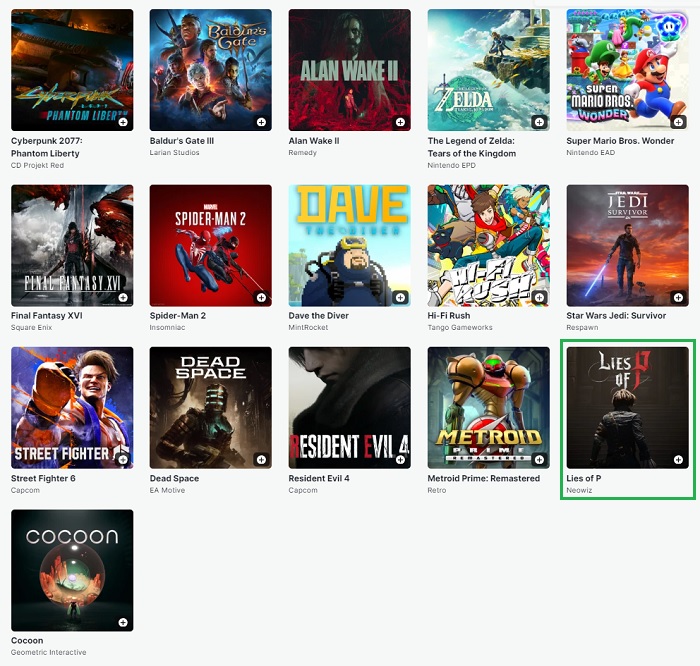 IGN은 2023년 최고의 게임 후보로 '발더스 게이트3'와 '앨런 웨이크2', '젤다의 전설: 왕국의 눈물', '슈퍼 마리오 브라더스 원더', '파이널 판타지 XVI', '데이브 더 다이버' 등 총 16종의 작품을 선정한 가운데, 네오위즈가 지난 9월 선보인 3인칭 액션 RPG 'P의 거짓'도 해당 후보군에 포함됐다.
