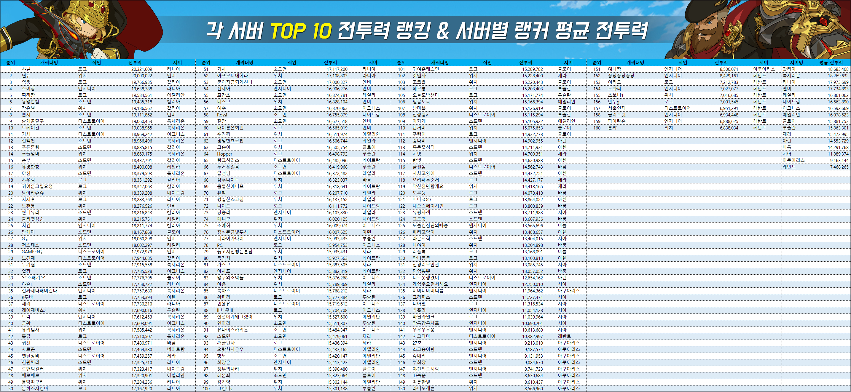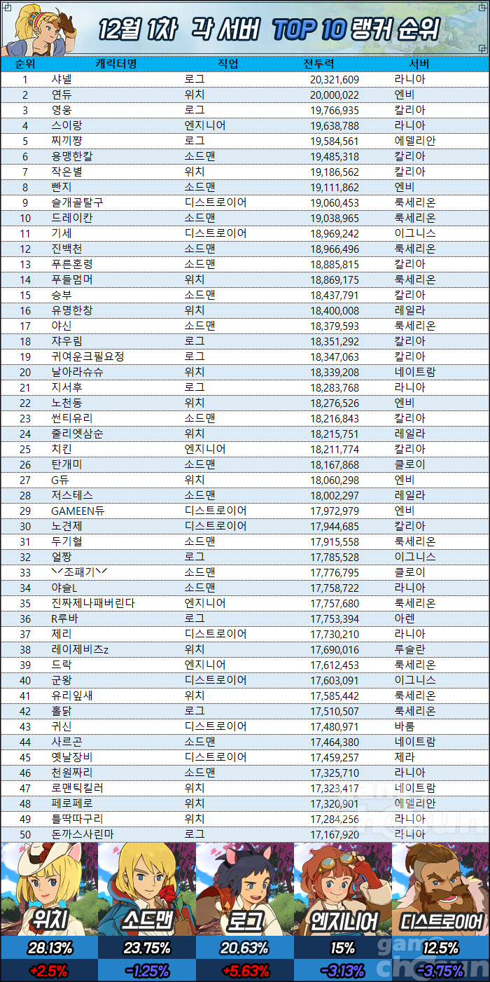 - 집계는 13일 10시부터 약 1시간 동안 실시됐으며, 누적 랭킹 메뉴의 캐릭터 전체 랭킹 항목을 기준으로 각 서버 상위 10명까지 선별했습니다. 집계 시간 동안 랭커들의 활동에 따라 전투력 및 직업에 오차가 발생할 수 있습니다.