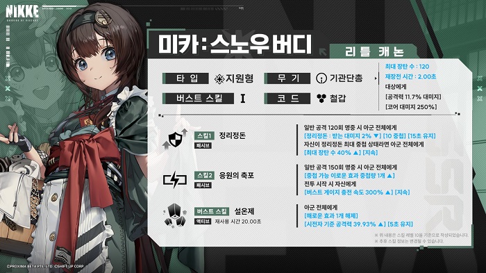 '미카: 스노우 버디'는 아군 전체 공격력 증가와 더불어 버프 중첩량 및 최대 장탄 수 증가, 디버프 해제 등 다양한 지원 스킬을 가진 버프형 캐릭터로, 기존 핵심 지원형 버스트 Ⅰ 자원인 '리타', '볼륨'을 보유하고 있지 않은 이용자가 활용할 수 있는 가능성을 가졌기에 주목받고 있다.