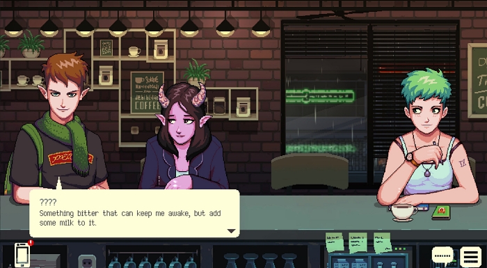 본 게임은 90년대 애니메이션에서 영감을 받은 픽셀아트로 그려졌으며, 게임 속에서 늦은 밤 따뜻한 음료와 정감 넘치는 대화에 어울리는 차분한 Lo-Fi(로파이) 음악을 감상할 수 있다. 또한 스토리는 대화 선택지가 아니라 고객을 어떻게 대하는지에 따라 분기하게 된다.