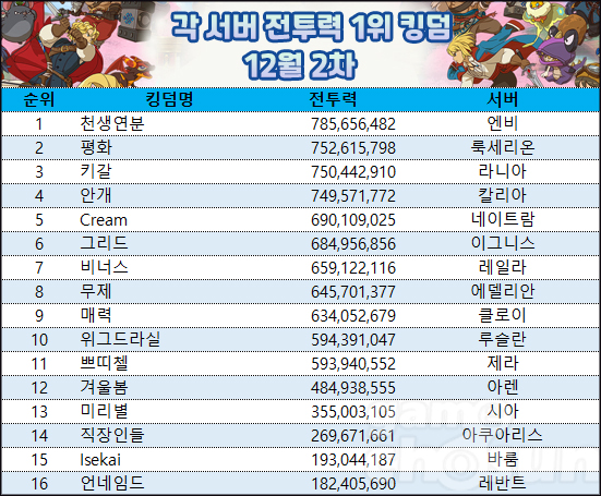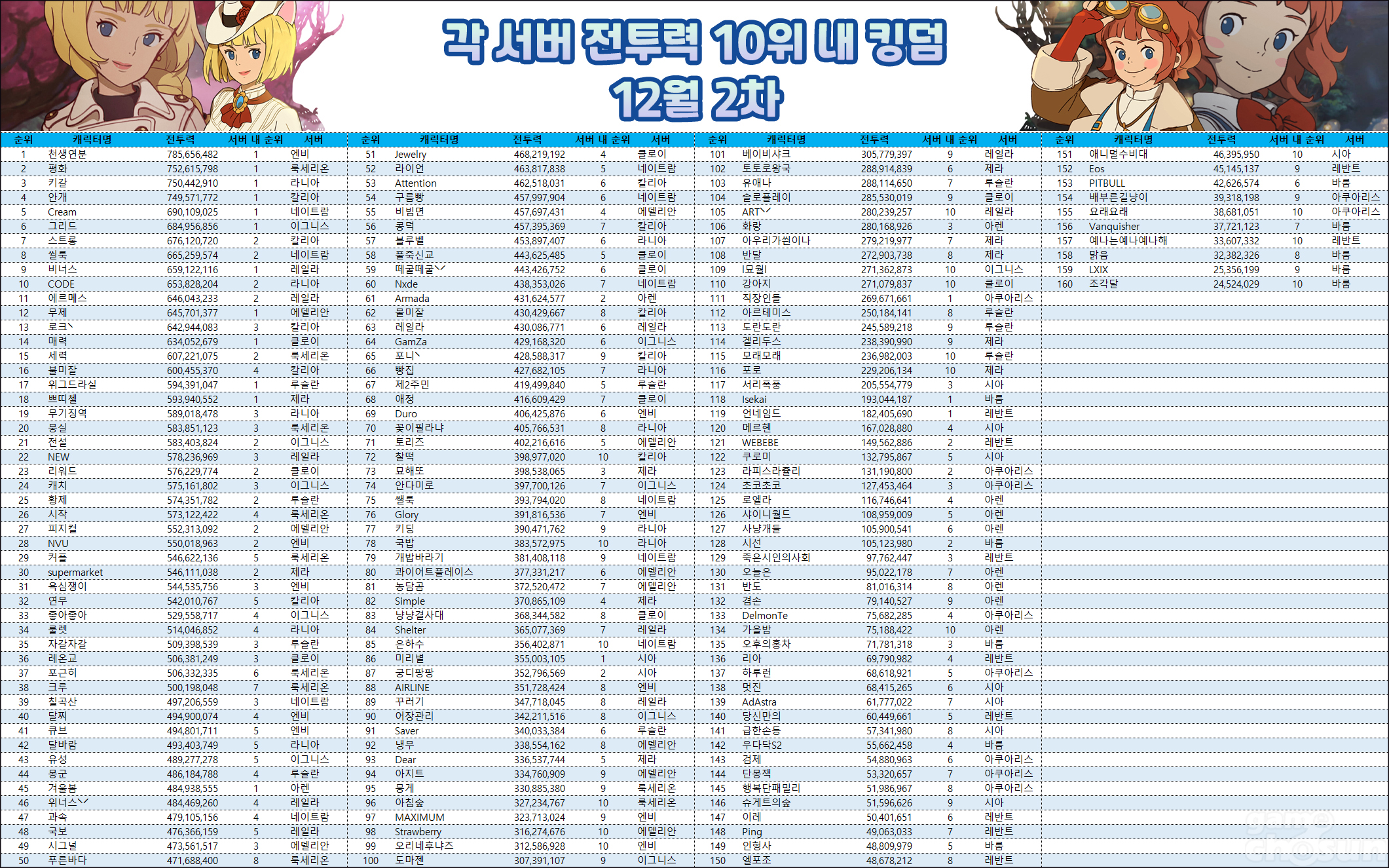 12월 2차 킹덤 랭킹 전 서버 1위는 엔비 서버 '천생연분' 킹덤이다. 천생연분 킹덤의 전투력은 785,656,482으로 지난 랭킹 대비 12,691,162 상승했다. 서버 이전 후에도 천생연분이 1위를 지키곤 있지만, 룩세리온 서버 '평화' 킹덤과 라니아 서버 '키갈' 킹덤, 칼리아 서버 '안개' 킹덤의 전투력이 급상승 하면서 뒤를 매섭게 쫓고 있다.
