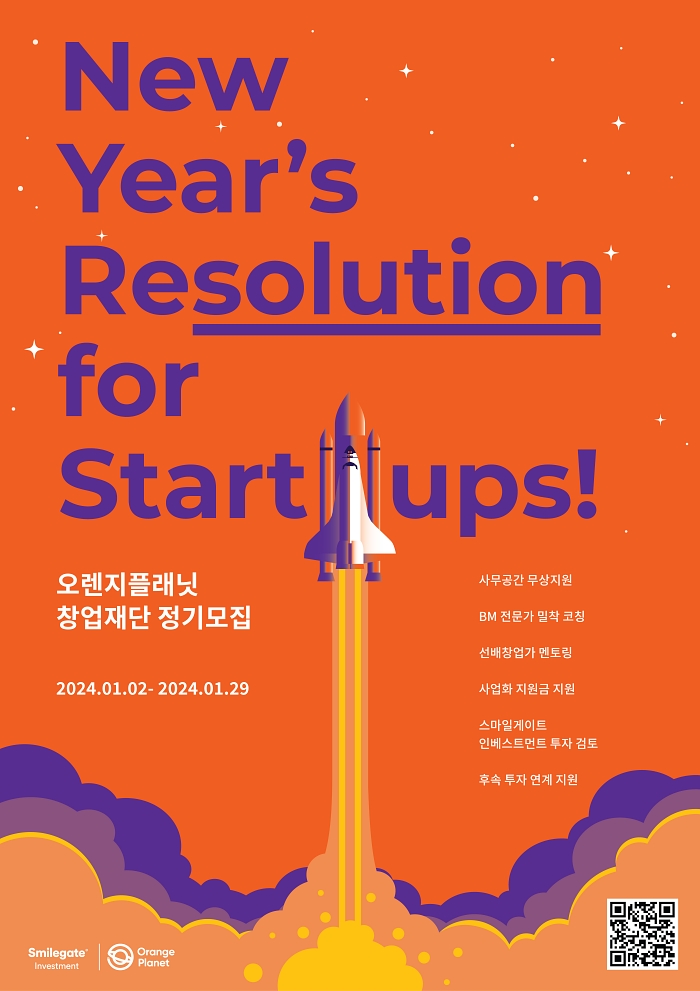 [자료제공 = 스마일게이트] 스마일게이트 오렌지플래닛 창업재단(이하 ‘오렌지플래닛’, 센터장 서상봉)은 2024 상반기 정기모집을 이달 29일까지 실시한다고 2일 밝혔다.