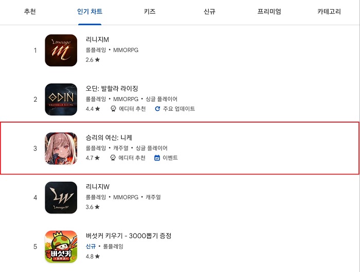 새해 기념 업데이트 및 이벤트를 통해 국내 애플앱스토어 매출 1위에 오른 바 있는 '승리의 여신: 니케'가 구글플레이 매출 3위에 오르는 쾌거를 이뤘다.