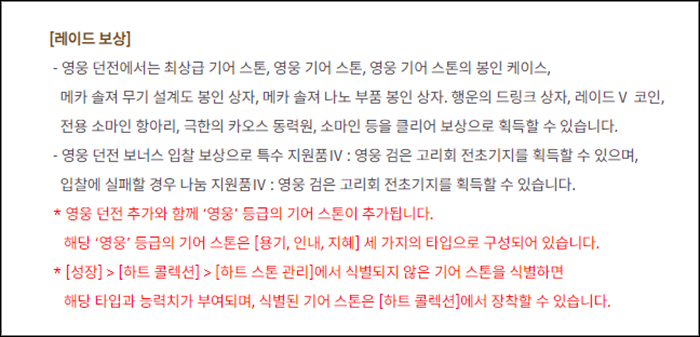 핵심 목표 보상을 꼽자면 저는 영웅 기어 스톤과 레이드 V코인을 중요하게 생각합니다. 하트 콜렉션이 더불어서 업데이트 됨에 따라 현시점에서 빠르게 성장할 수 있는 수단 중 하나이기 때문입니다. 소마인도 수급하기 쉬워져서 꽤 좋게 보고 있습니다.