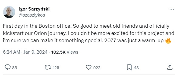 네러티브 디렉터인 이그로 사진스키는 자신의 SNS를 통해 미국 보스턴에 위치한 사무실로 첫 출근을 했다고 언급하는 한편, '오리온' 프로젝트를 공식적으로 시작하게 됐다고 밝혔다. 특히 그는 "'사이버펑크 2077'은 그저 워밍업일 뿐이었다"라고 전하면서 오리온 프로젝트는 전작보다 훨씬 큰 볼륨의 게임이 될 것임을 암시했다.
