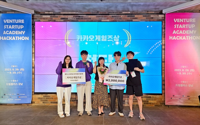 임지현 카카오게임즈 부사장(가운데)이 ‘제1회 벤처·스타트업 아카데미 해커톤 대회'에서 ‘카카오게임즈상’ 수상자들과 기념촬영을 하고 있다.