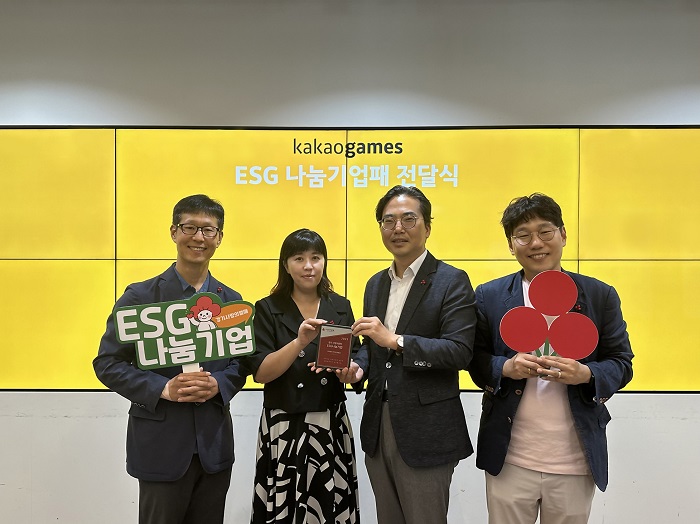 (왼쪽부터) 카카오게임즈 안병도 대외협력실장, 임지현 부사장, 경기 사랑의열매 김효진 사무처장, 강성훈 사회공헌팀장이 ‘ESG나눔기업패’ 전달식에 참석해 기념사진을 촬영하고 있다.