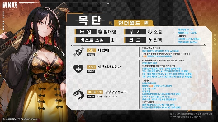 먼저, 지난해 4월에 유저들의 눈도장을 찍은 ‘목단’은 방어형 SSR 등급의 니케로, 위풍당당한 외모, 허스키한 목소리와는 반전되게 적극적으로 적을 위협하면서도 평소에는 허당끼가 가득한 외강내유형의 성격을 지녔다.