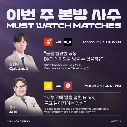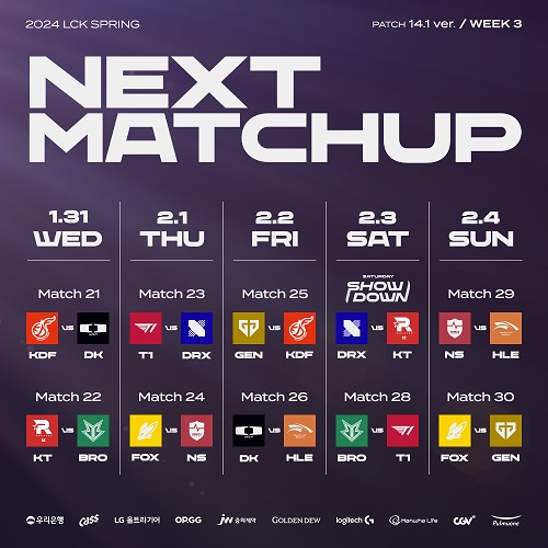 2024 LCK 스프링 3주 차는 아프리카TV, 네이버 e스포츠&게임, 유튜브 LCK 채널 등 온라인 플랫폼을 통해 생중계된다.