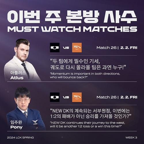 영문 중계진인 '아틀러스(Atlus)' 맥스 앤더슨(Max Anderson)과 국문 중계진인 '포니' 임주완 해설 위원은 2월 2일 열리는 디플러스 기아와 한화생명e스포츠의 경기를 본방 사수해야 한다고 밝혔다. 맥스 앤더슨은 "주춤한 두 팀 중에 궤도로 다시 올라올 팀을 가리는 경기"라고 말했고 임주완 해설 위원은 "새로이 진용을 꾸린 디플러스 기아가 상위권을 연이어 만나는 과정에서 승리를 따낼 수 있을지 관심이 모인다"라며 추천했다.