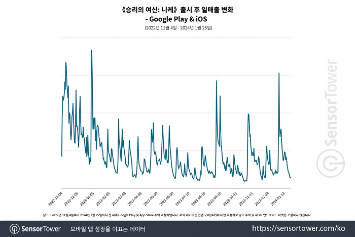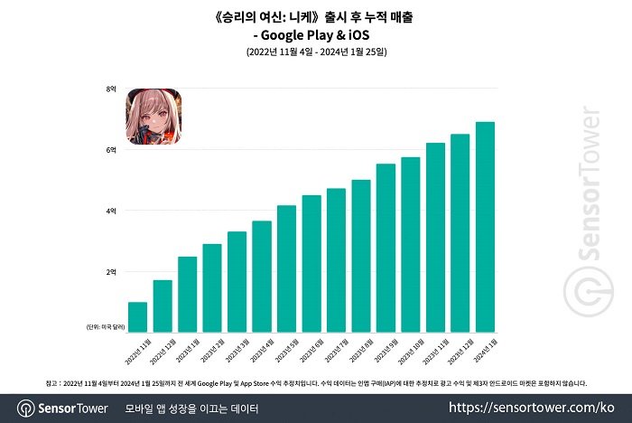 이처럼 승리의 여신: 니케는 꾸준한 인기를 유지한 덕분에 전 세계 누적 매출 7억 달러를 기록할 수 있었다. 센서타워에 따르면 승리의 여신: 니케는 2022년 11월 정식 출시 이후 올해 1월까지 전 세계 모바일 게임 매출 순위 18위를 기록했다고 전했으며 국가별 누적 매출 비중은 일본 57.6%, 미국 15.3%, 한국 13.7%로 글로벌 시장에서 큰 성공을 거두고 있다고 밝혔다.