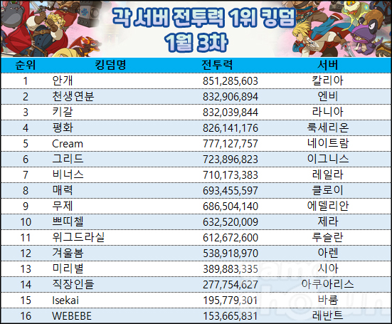 넷마블 제2의 나라 1월 3차 킹덤 전투력 랭킹 1위는 칼리아 서버 '안개'가 차지했다.