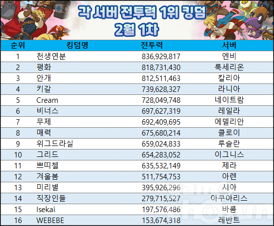 넷마블 제2의 나라 2월 1차 킹덤 전투력 랭킹 1위는 엔비 서버 '천생연분'이 차지했다.