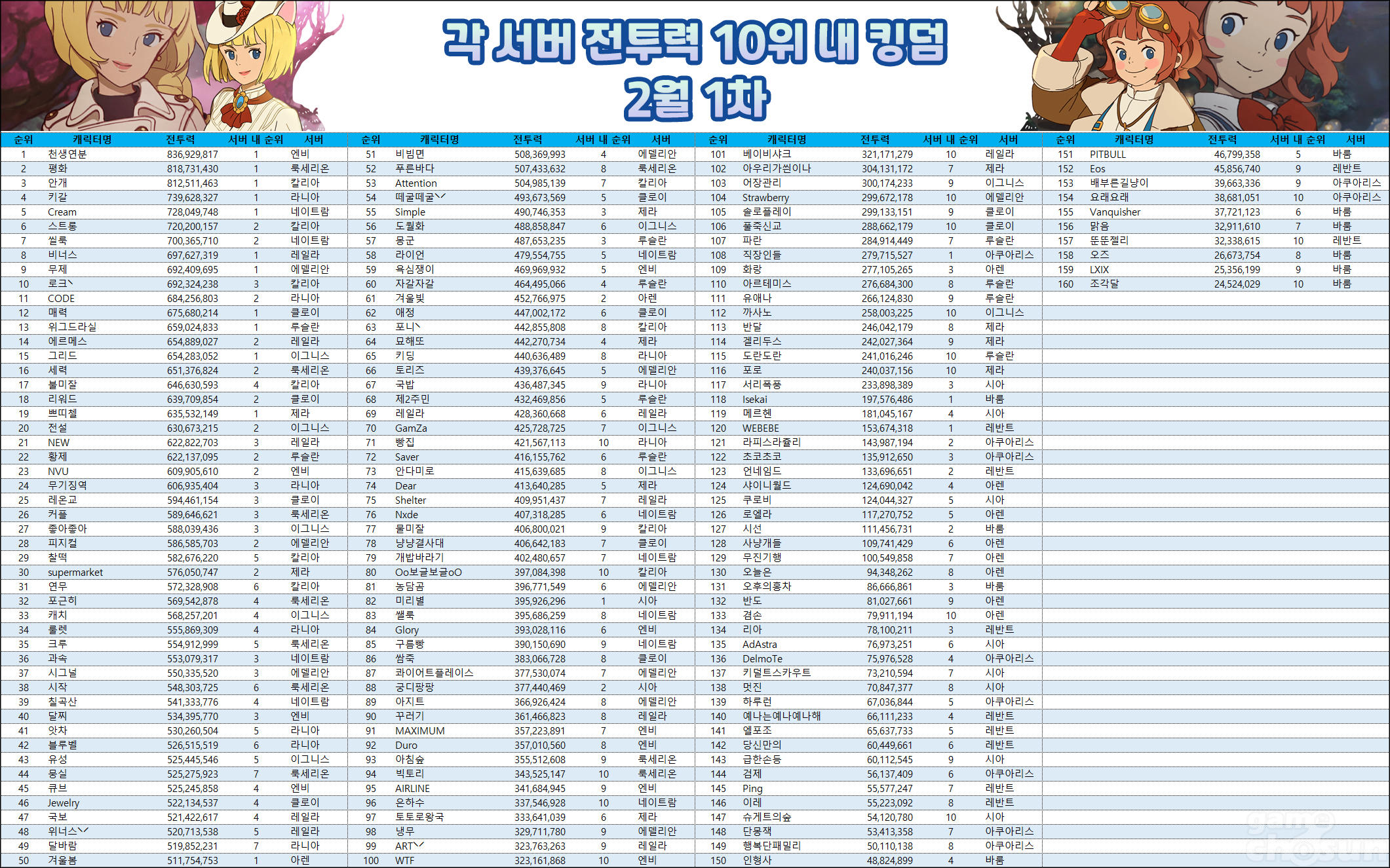 ■ 각 서버 전투력 상위 10위 내 킹덤 종합 집계