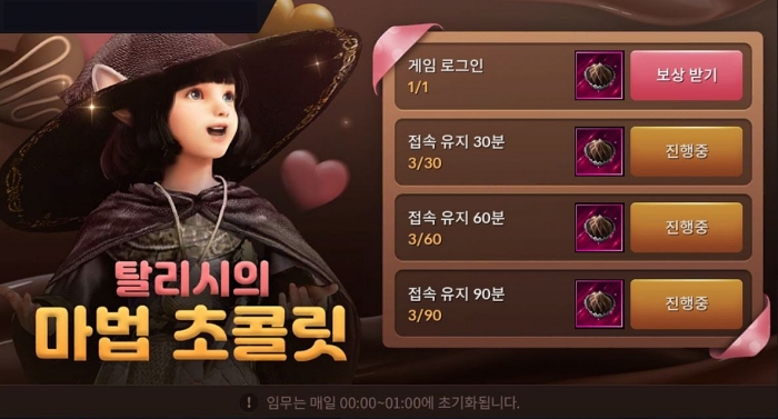 게임 접속 및 접속 유지 시간에 따라 이벤트 아이템 ‘탈리시의 마법 초콜릿’을 보상으로 지급한다. 초콜릿 사용시 ▲심연~태고 등급 기억 각인 상자 ▲고대 미감정 문양 각인서 ▲빛의 성수 200개 ▲장인의 실타래 10개 ▲아토르의 시련 : 고대입장권 중 1종의 아이템을 얻을 수 있다.