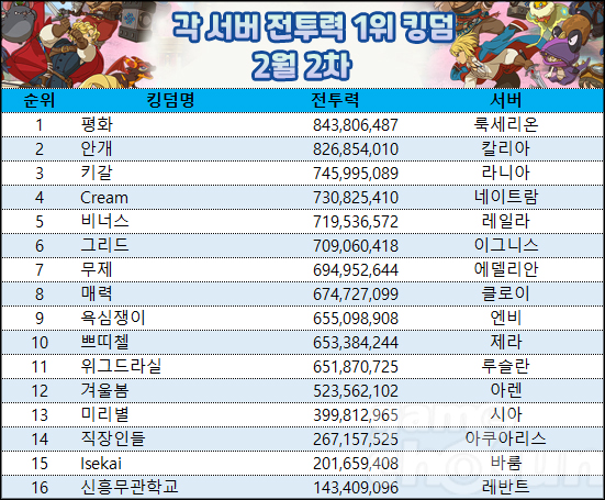 2월 2차 킹덤 랭킹 전 서버 1위는 룩세리온 서버 '평화' 킹덤이다. 지금까지 아깝게 정상의 자리를 놓쳤던 평화 킹덤이 처음으로 킹덤 전투력 랭킹 1위라는 쾌거를 달성한 것이다. 평화 킹덤의 이번 랭킹 전투력은 843,806,487로 지난 랭킹 대비 25,075,057 상승했으며, 2위를 기록한 칼리아 서버 '안개' 킹덤과 차이는 16,952,477이다. 안개 킹덤은 오랫동안 1위를 지킨 기록을 가진 킹덤인 만큼 향후 정상 대결은 두 킹덤의 맞대결이 될 것으로 예상된다.