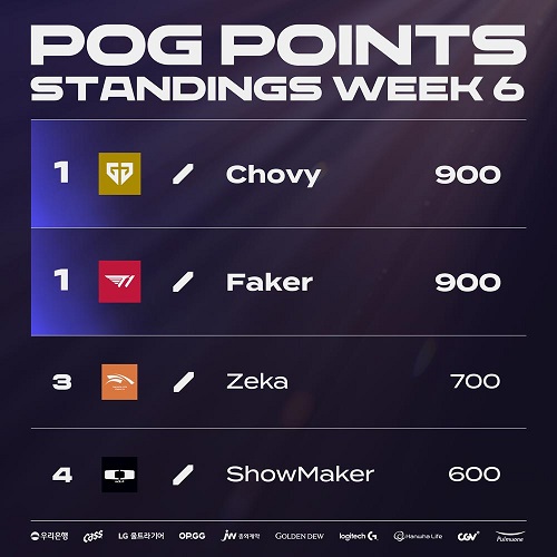 이상혁도 곧바로 추격했다. 피어엑스와의 1세트에서 코르키를 고른 이상혁은 팀을 승리로 이끌었고, LCK 통산 코르키 21연승을 이어가면서 POG로 선정됐다. OK저축은행 브리온과의 2세트에서 탈리야로 발빠르게 합류하면서 킬을 챙긴 이상혁은 POG로 뽑히면서 정지훈과 똑같은 900 포인트를 마크하며 6주차를 마무리했다.